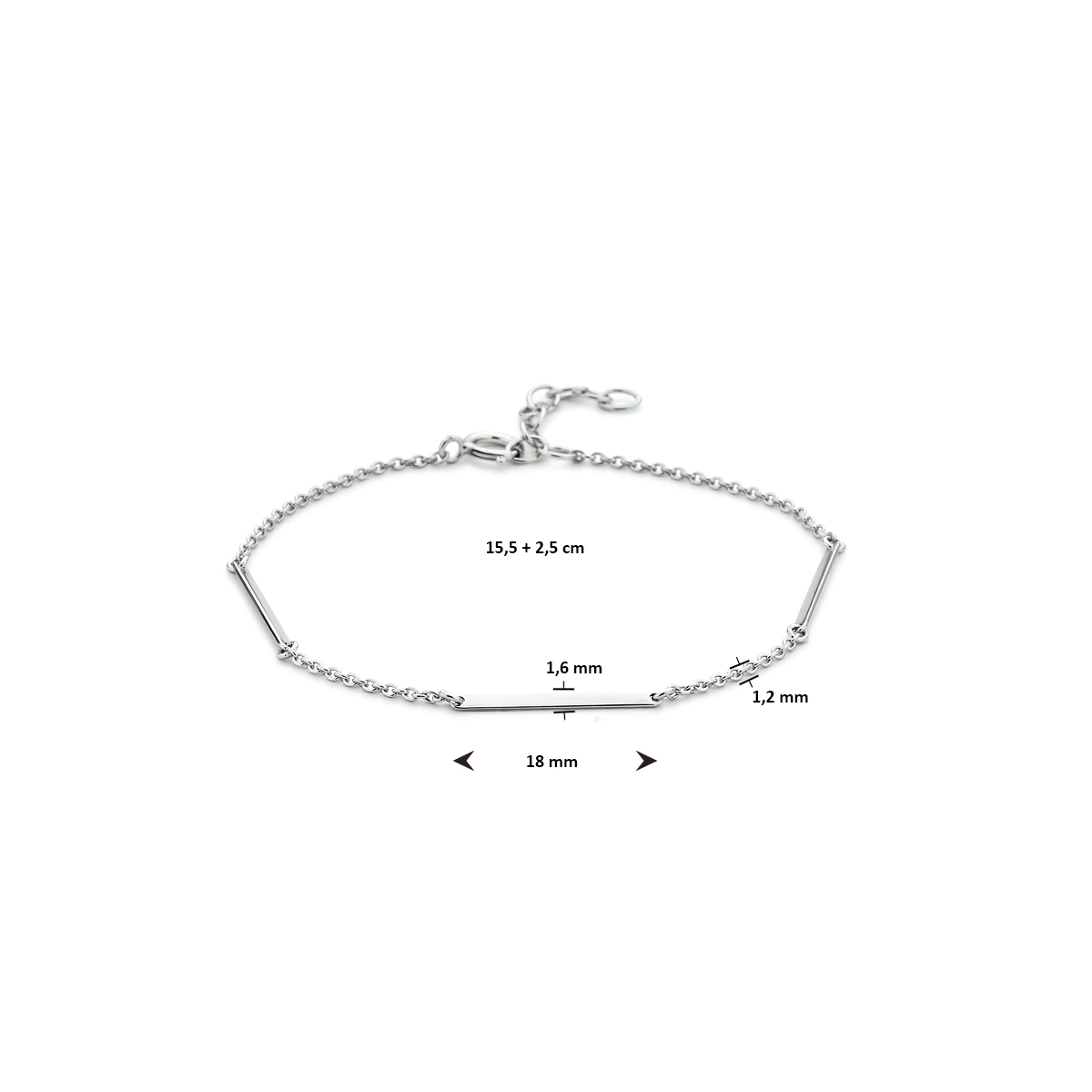 Gerhodineerd 925 zilveren armband uitgevoerd met balkjes met een afmeting van 1.6x18mm. De armband heeft een draaglengte van 15.5cm met een extensie van 2.5cm. De schakelbreedte is 1.2mm.