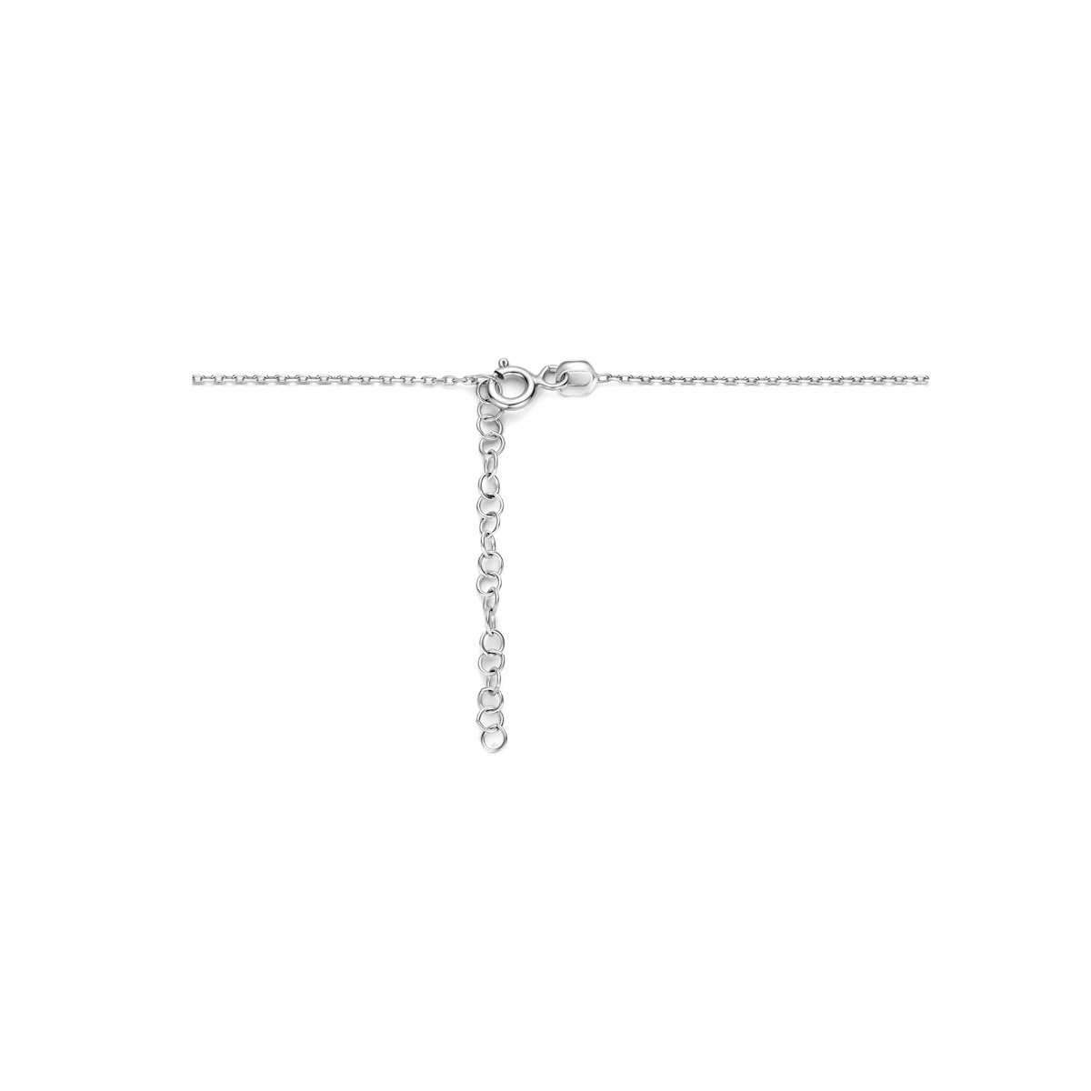 Gerhodineerd zilveren hanger met schitterende zirkonia. Het collier heeft een draaglengte van 41cm en een extensie van 4cm. De schakelbreedte is 1.0mm.