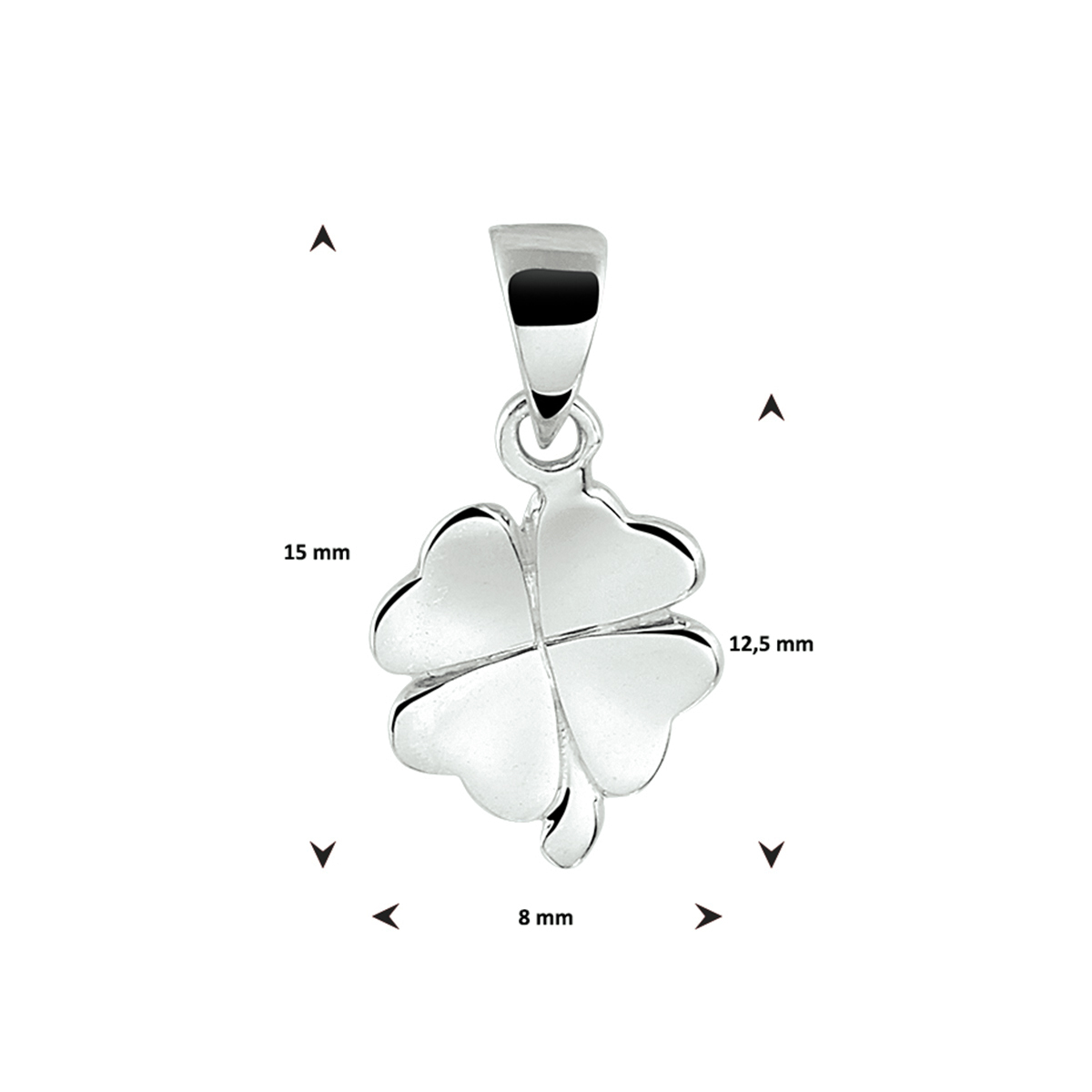 Gerhodineerd zilveren hanger in de vorm van een klavertje. De hanger heeft een totale hoogte van 1.5cm. De hanger heeft een afmeting van 12.5x8mm.