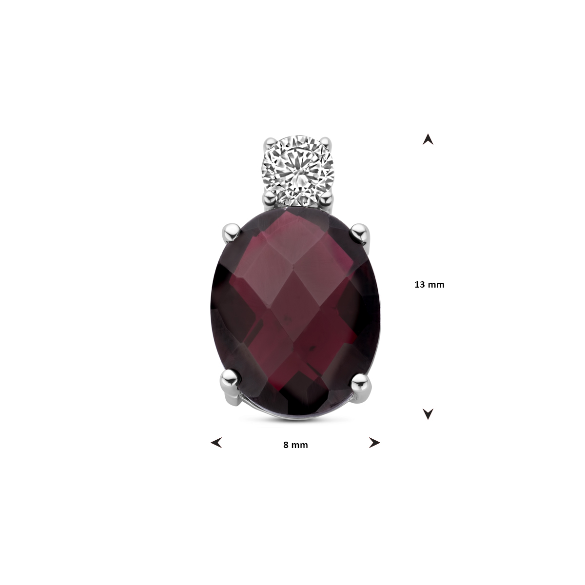 Gerhodineerd zilveren hanger uitgevoerd met granaat en zirkonia. De hanger heeft een afmeting van 13x8mm.